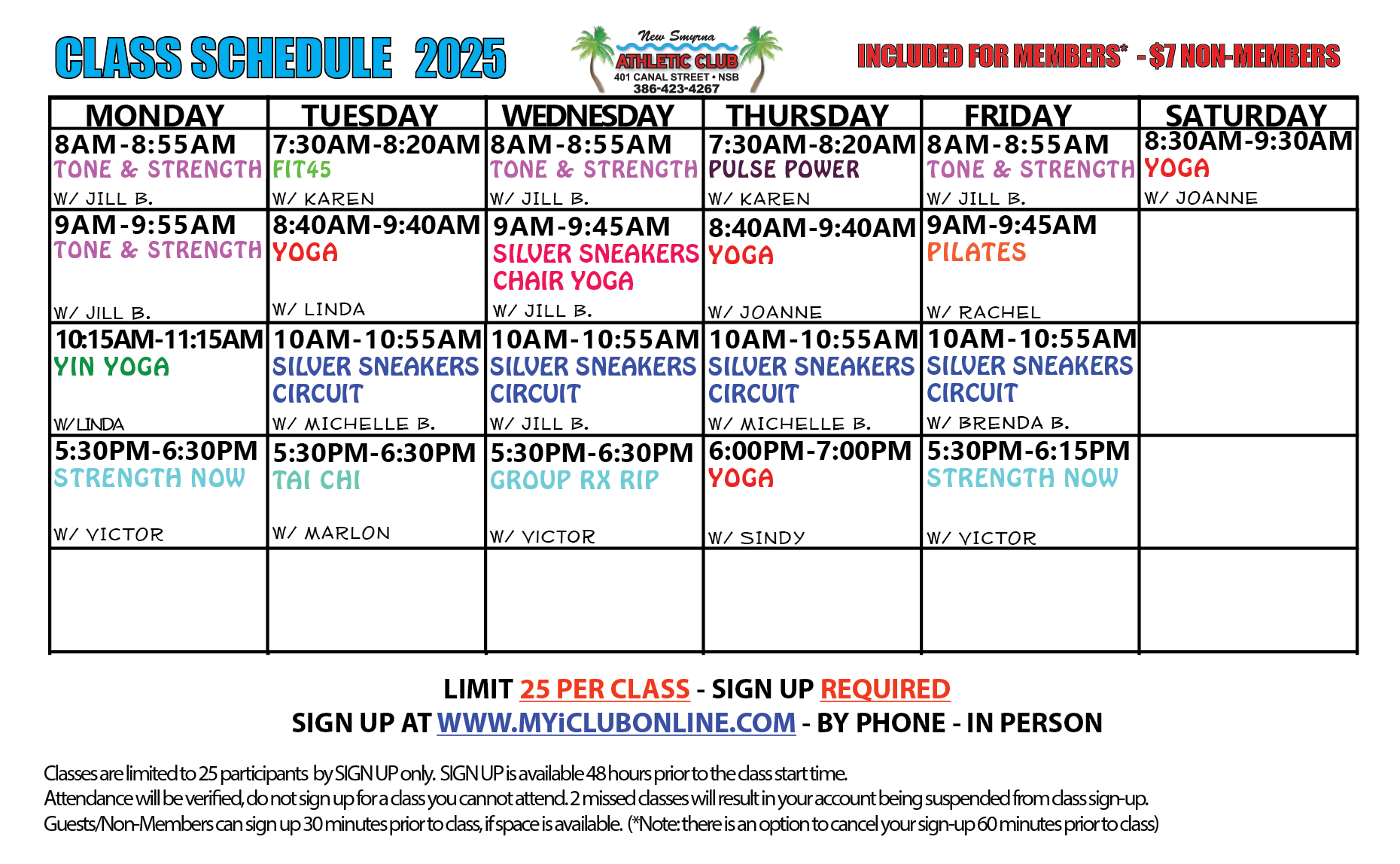 Not only can you check these resources for updates to our opening times, you can also check on Facebook, myiClubOnline or our website for the most up to date class schedule. Classes will start to be full again soon, as they're in HIGH demand, and we recognize it can be frustrating when you are unable to register for a class, but their availability will always be on a first come, first serve basis. All active members of the club - regardless if you have signed up for 1 month or 1 year, will be given an equal opportunity to attend our classes. NSAC offers the MOST FREE classes in the area. Please thank your instructors for making themselves available and for the hard work they put into teaching classes at the club, it can be very difficult and stressful on them at times. We understand more classes would be great, but we are limited by space, time slots and available instructors. Members are able to sign up for class 48 hours ahead of time by going to MyiClubOnline.com - if a class is full, you will need to check if a spot has opened up regularly. The waitlist has been DISCONTINUED. If you are not registered for a class, you will NOT be able to attend. All spots are available on a first come first serve basis - regardless of membership types. Calling and leaving a voicemail to be signed up for class also DOES NOT reserve a place in that class, as our voicemail is checked during business hours and all spaces in those classes will likely have been taken by members signing up online - which is the most efficient and effective way to sign up for classes.